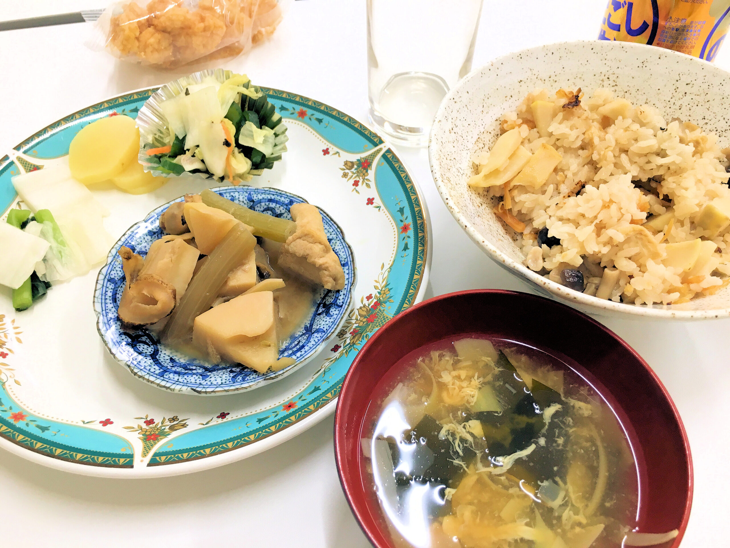この日のメニューは旬のたけのこをふんだんに使ったお料理が並びました! ふっくら柔らか優しい味のタケノコご飯、ホタテの貝ひもとフキがアクセントになっている、タケノコの煮物、ご自宅で作ってきてくれた野菜の浅漬け、そしてタケノコの柔らかな皮の部分や油揚げ、溶き卵が入ったお吸い物。